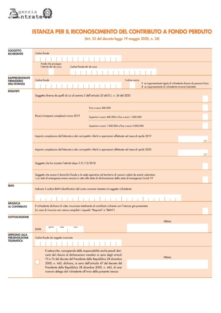 Il modello per richiedere i contributi a fondo perduto è stato caricato online dall’Agenzia delle Entrate. Ecco il link per scaricarlo e tutte le informazioni.